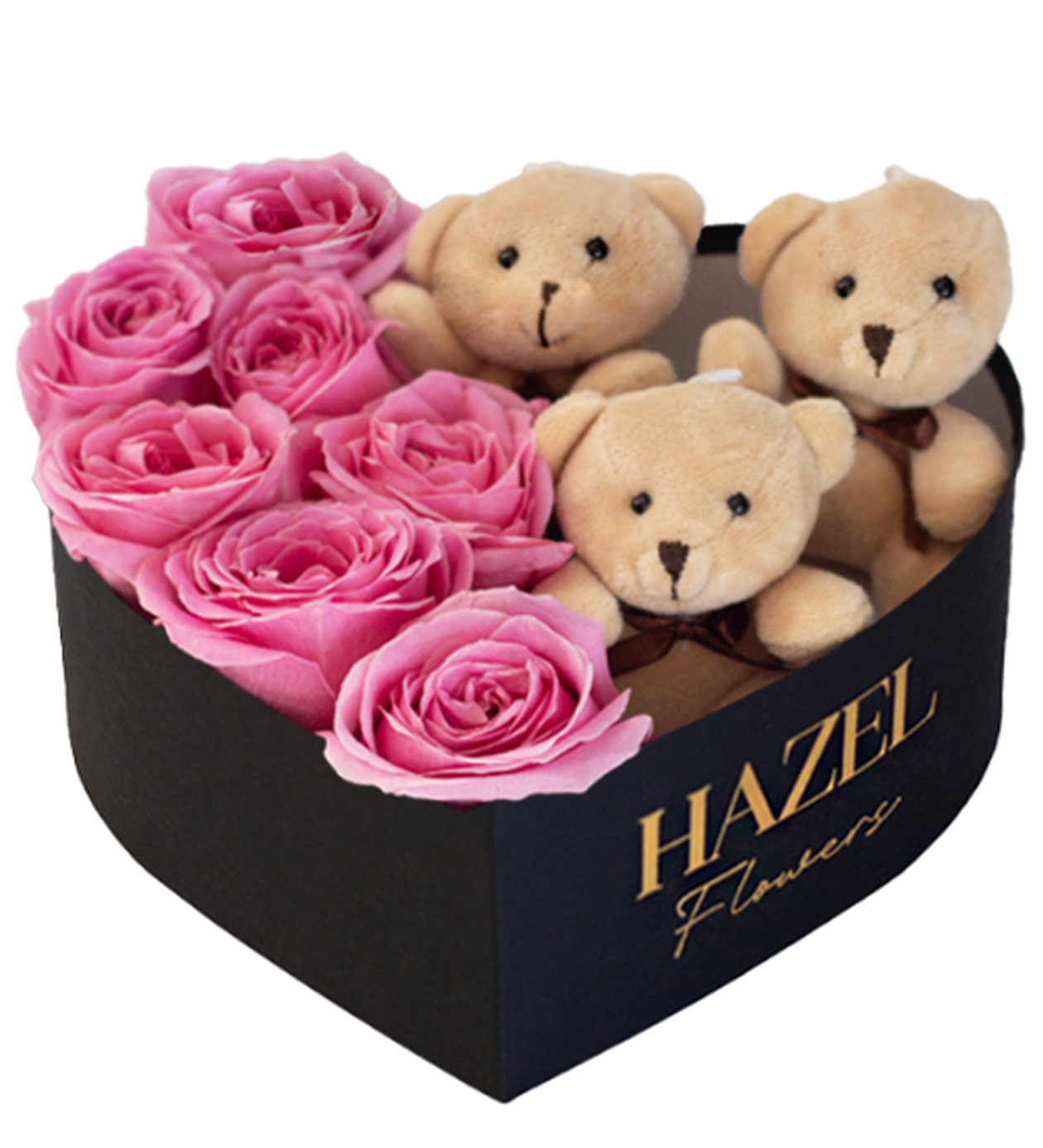 Şık kalp kutu içinde taze pembe güller, sevimli peluş ayıcıklar ile hazırlanmış bu özel aranjman;